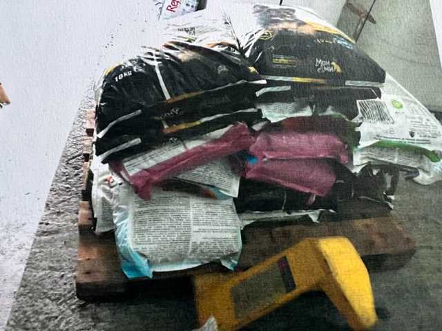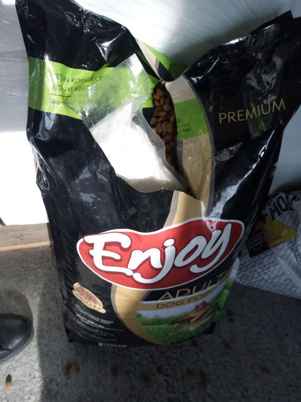 В част от пликовете с кучешка храна откриват шест пакета, обгърнати с транспарантно фолио, съдържащи метамфетамин. Общото арестувано количество метамфетамин е 3 608 грама.