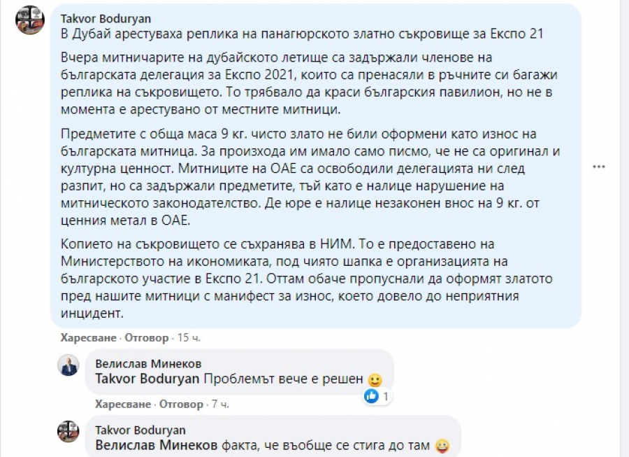 Вчера митничарите на дубайското летище са задържали членове на българската делегация за Експо 2021, които са пренасяли в ръчните си багажи имитация на съкровището. То трябвало да краси българския павилион, само че сега е задържано от локалните митници.