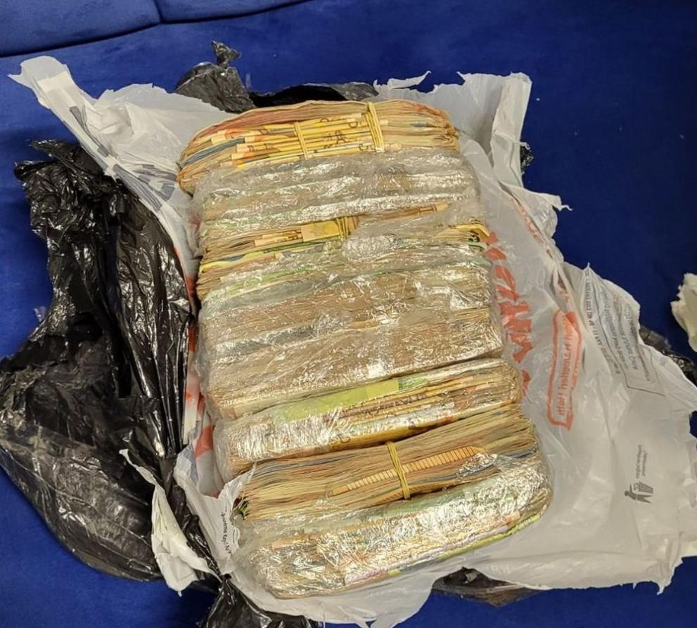 При осъществения оглед на товарното помещение митническите инспектори откриват, че в едно от палетата е скрита жълта чанта, в която има три пакета огромно количество валута, с номинал от 10, 20, 50, 100 и 200 евро.