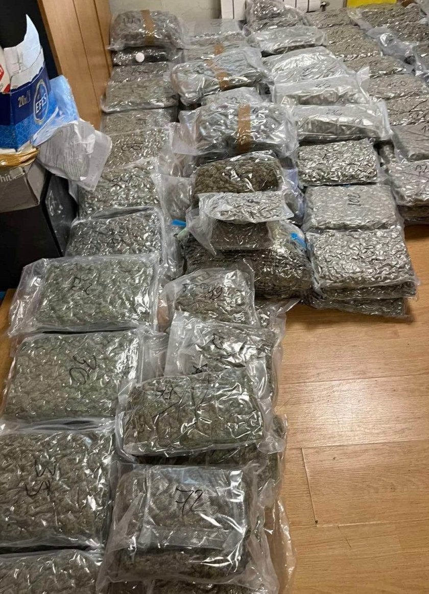 При осъществения полеви наркотест наличието на пакетите реагира на марихуана. Общото количество намерено и арестувано наркотично вещество е 97 952 грама.