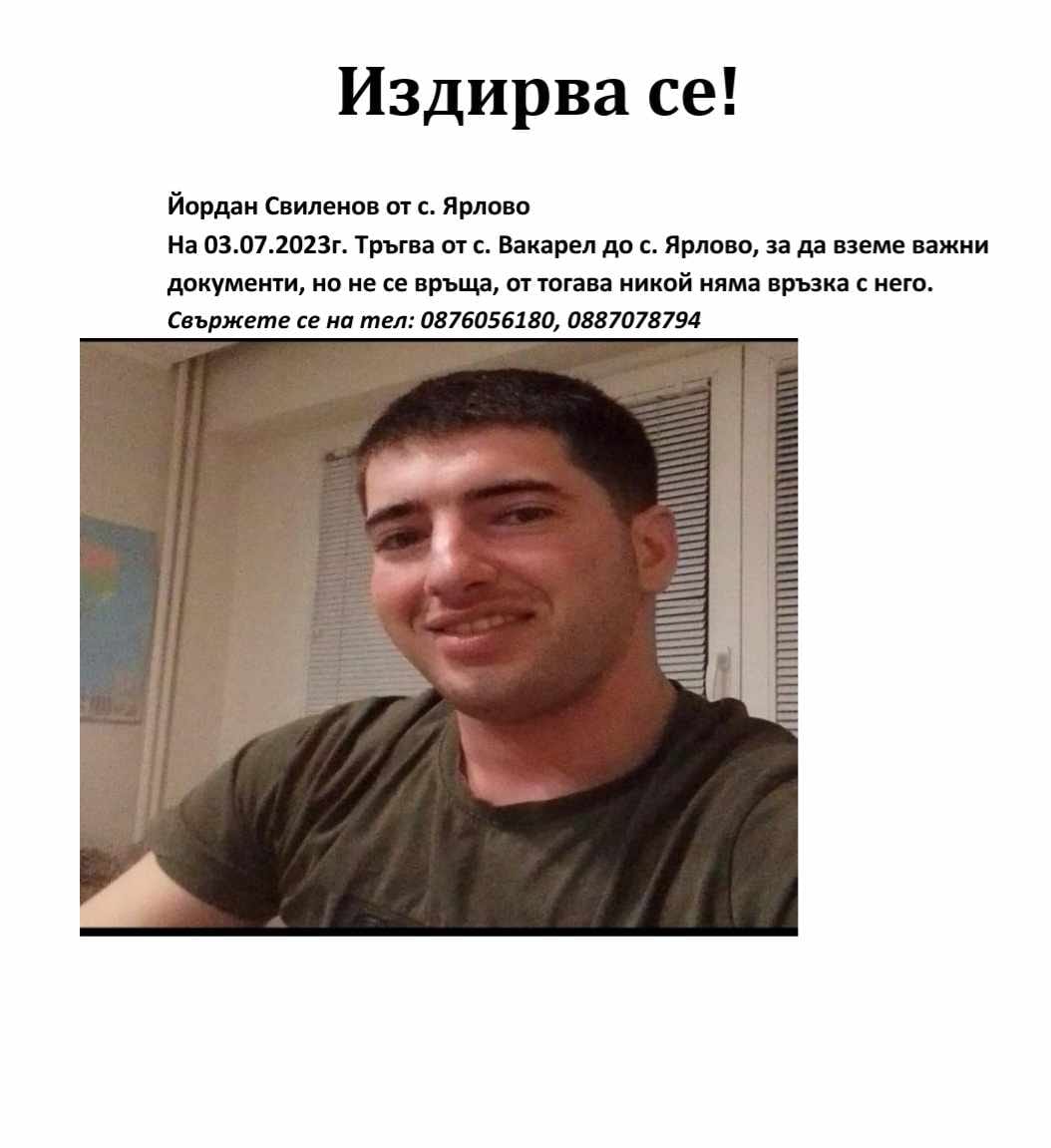 Млад мъж е в неопределеност от понеделник (03.07). Негови близки се надяват на информация за Йордан Свиленов от село Ярлово.