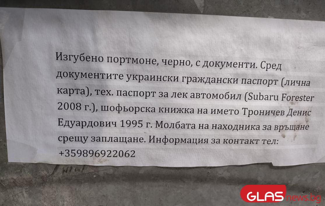 Млад украинец е изгубил портмоне с персонални документи в Пловдив. Случаят е от региона на квартал " Захарна фабрика " до бул. " Васил Априлов ".