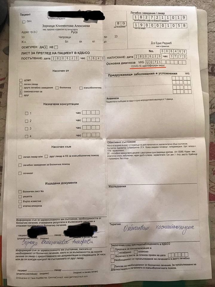 Млада жена се оплака, че е диагностицирана с ковид без да й бъде изработен тест, научи Lupa.bg. Тя посетила болничното заведение в Русе поради алергия от цъфтящи липи и затруднено дишане. От лечебното заведение я попитали дали желае да лежи в болничното заведение 10 дни, само че тя отказала. Лекарите й дали да подпише амбулаторен лист, само че дамата не погледнала какво подписва поради неразположението.