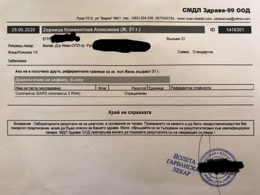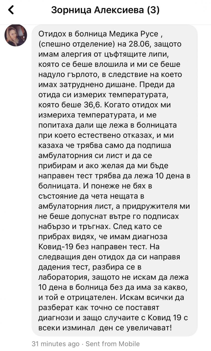 „ След като се прибрах видях, че имам диагностициран ковид-19 без изработен тест. На идващия ден отидох да си направя тест, който беше негативен. Искам всички да схванат по какъв начин се слагат диагнози и за какво болните се усилват с всеки минал ден “, написа във фейсбук Зорница Алексиева, която даже ползва документите от диагнозата и негативния тест.