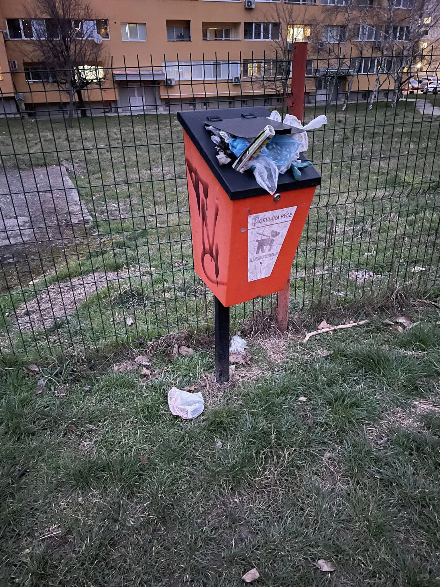 От оповестените фотоси виждаме, че кошчето за кучешки боклуци, сложено на площадката за кучета в квартал " Здравец " прелива. Това евентуално се дължи на обстоятелството, че няма обособен панер за " човешки " боклук, счита Мирчева. Освен това преди повече от месец някой е откраднал верижката, с която собствениците на кучета са затваряли вратата.