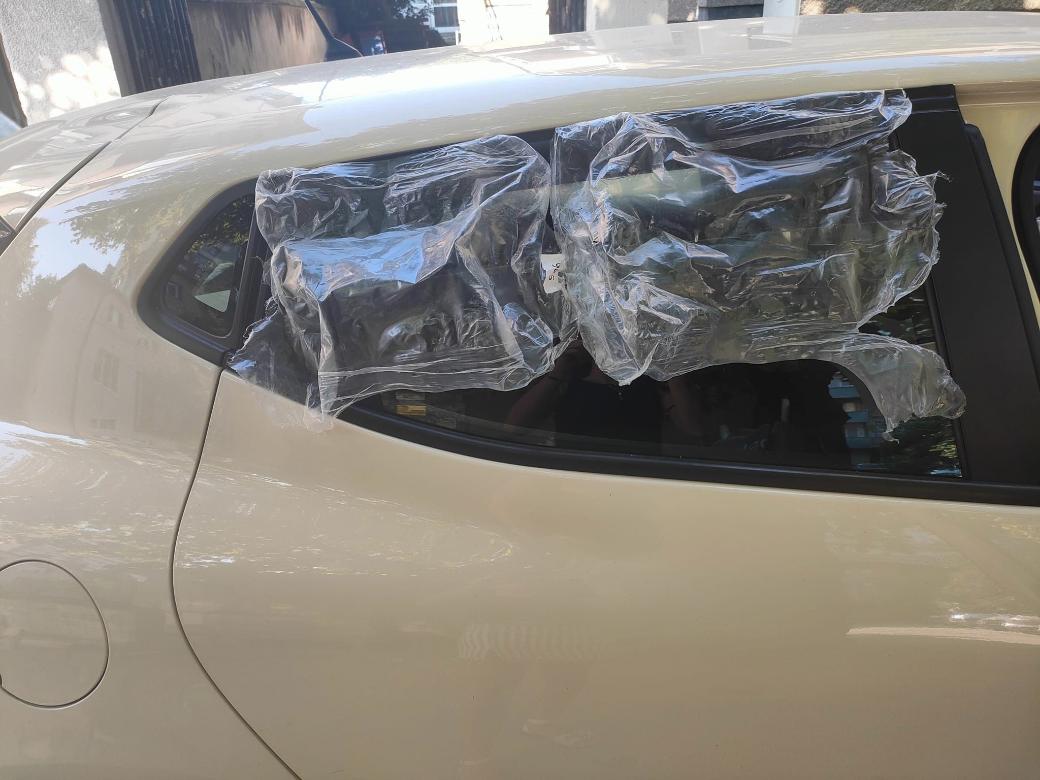 Днес, когато отива към автомобила си, заварва непредвидена панорама. Добър човек е сложил найлонова опаковка, с цел да закрие отвора.