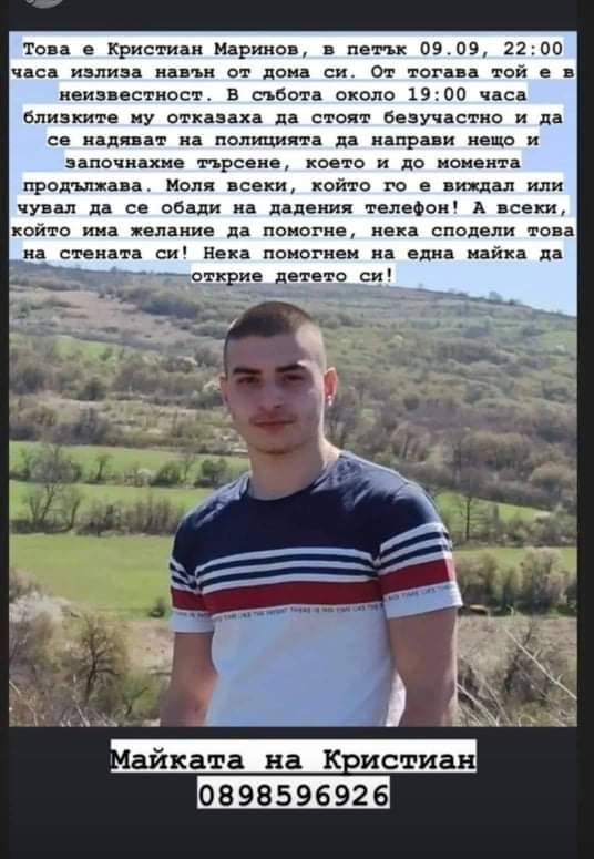 " Моля,ако някой има информация за момчето да се свърже с майката - Поля Маринова на посочения телефон. ", моли Мери Благоева, другарка на майката. Младежът се търси и отвън рамките на град Ловеч. За последно Кристиан е бил облечен с облекла като на тази фотография, прибавя още Благоева: