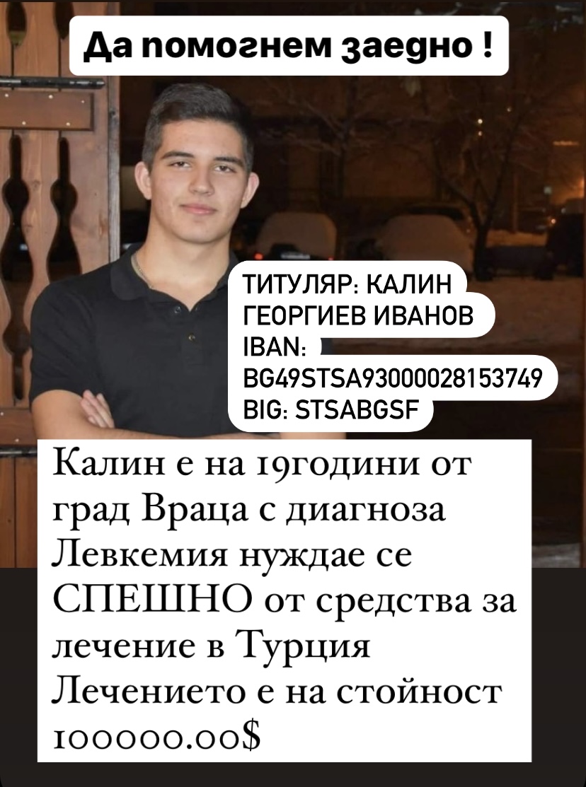 Калин Иванов е на 19 години и е с диагноза " Левкемия ". Онкологичното заболяване се развива бързо. То може да се лекува в Турция, само че за това на момчето и фамилията му са нужни 100 000 $. Тази сума обаче е непостижима за околните на Калин.