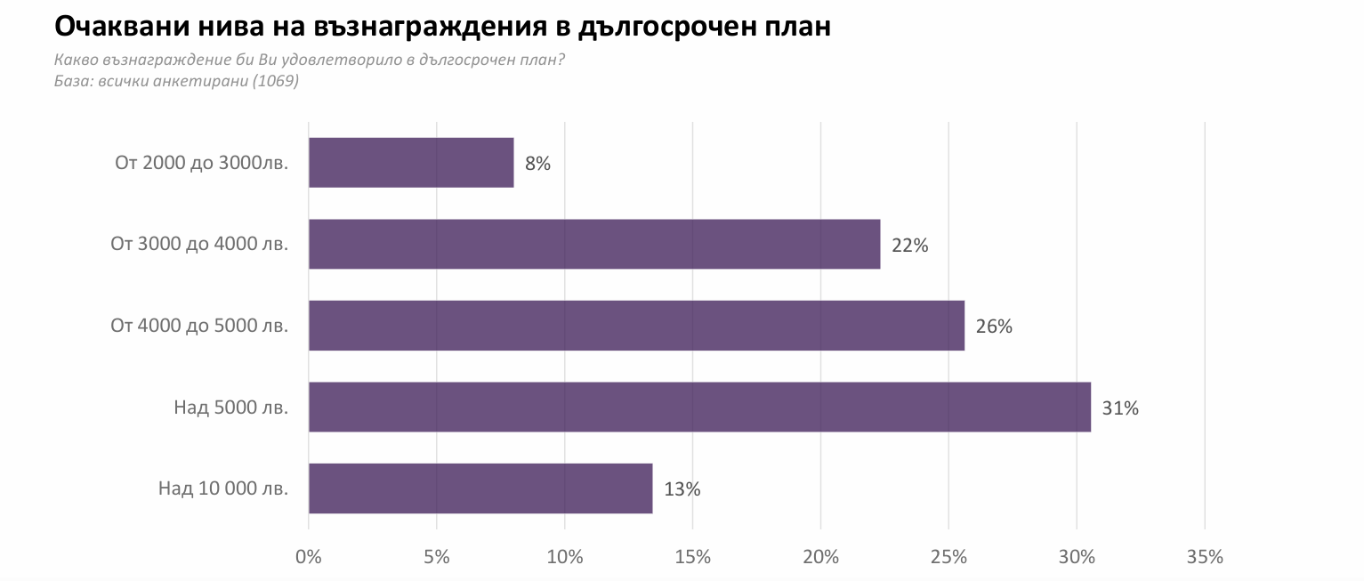 Повече от половината студенти имат реалистични упования за първа заплата, попадаща в диапазона от 1000 до 2000 лева. В дълготраен проект младежите показват доста по-високи финансови упования, като максимален % се надяват на заплащане над 5000 лева (31%) и даже над 10 000 лева (13%), което демонстрира мощни упоритости за професионално и финансово израстване, само че евентуално отразяват и общия подтекст, образуван през последните години, в който се приказва за стабилно, изпреварващо инфлацията, повишаване на приходите в България. Тези данни сочат, че въпреки болшинството студенти да е с по-скоро реалистични показа, има и немалка част със повишени упования, което не е изключено да докара до известно отчаяние при нахлуване на пазара на труда.
