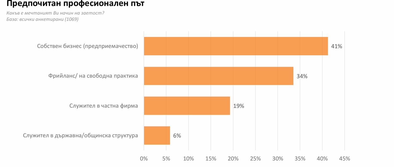 Най-голям дял от студентите мечтаят за личен бизнес (41% ) или за работа като фрийлансъри (34%), което демонстрира мощен интерес към автономия и еластичност в професионалния път. " Служител в държавна/общинска конструкция " остава минимум пожеланият вид във всички групи (6%), макар покачващите се хонорари за някои от длъжностите.