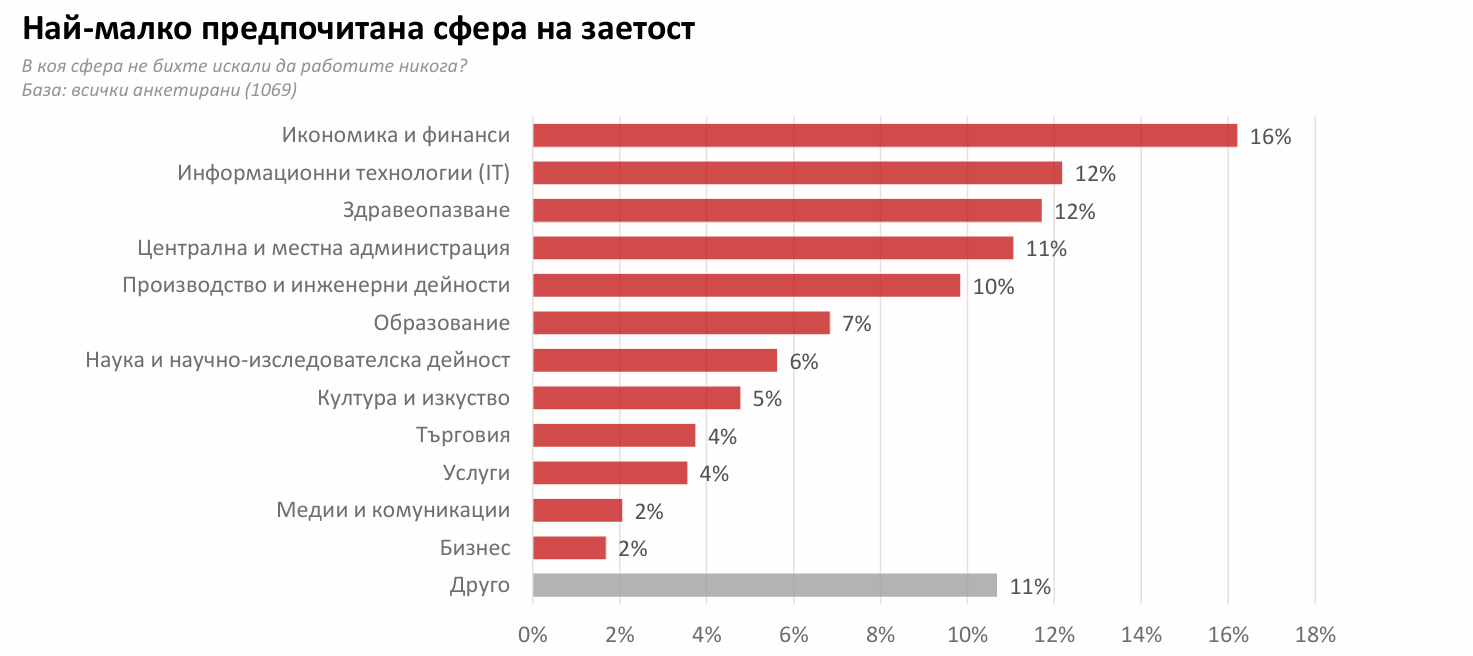 Резултатите демонстрират, че забележителна част от студентите в извадката са привлечени от изобретателни и динамични браншове, както и от благоприятни условия за независима реализация в бизнеса, което е в унисон с изразения предприемачески дух и интереса към работа на свободна процедура. Най-висок % от интервюираните желаят да работят в сферата " Култура и изкуство " (33%), следвани от " Бизнес (маркетинг, мениджмънт, предприемачество) " с 19% и " Медии и връзки " с 10%. Други сфери като опазване на здравето, обучение, IT и просвета са посочени от по-малък дял студенти (по 4%). Производство, инженерни действия, услуги и търговия са измежду минимум желаните.