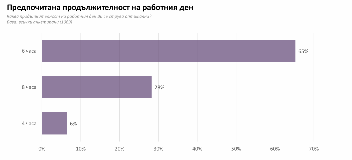 Оптималната дълготрайност на работния ден за болшинството студенти е 6 часа (65%). Това акцентира желанието към по-интензивна, само че по-кратка дневна ангажираност. Младежите избират плаващото работно време с еластичен начален час, което приказва за блян към независимо образуване на работния ден. Въпреки че са склонни и на ненормиран труд, студентите избират отплата в свободно време пред финансова отплата.