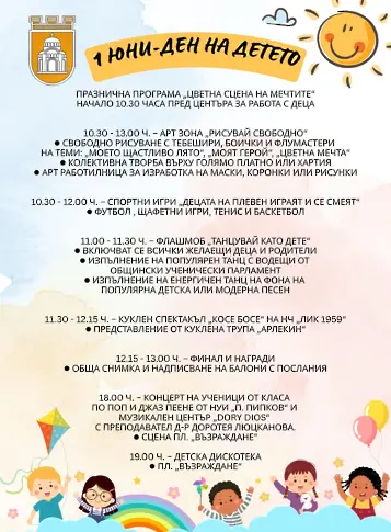 Много и разнородни ще са самодейностите в Плевен, отдадени на празника на детето – 1 юни. Спортни, просветителни, изобретателни, надпревари, песни и танци – всеки може да откри забавното за него събитие в празничния ден.