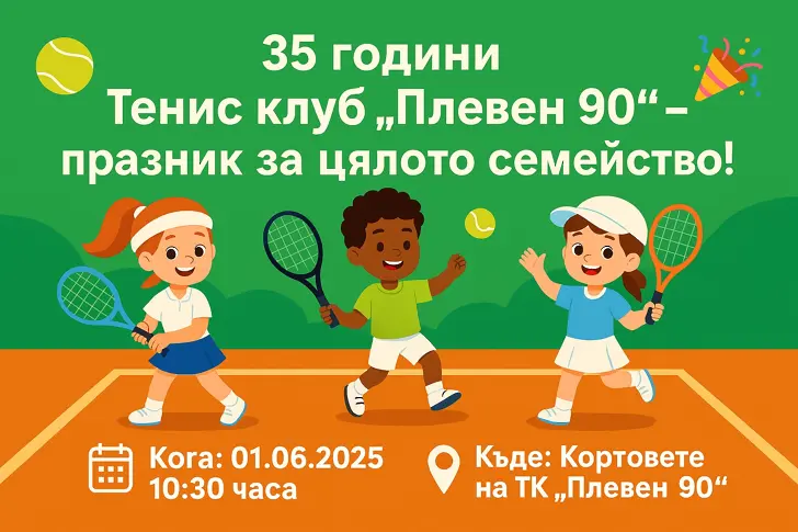 35годиниот основаването си посреща тенис клуб „ Плевен90 ” и по този мотив провежда празникзацялотосемейство на 1 юни. Той ще стартира в 10.30 часа на кортовете на Търговска колегия „ Плевен 90 “, богатата стратегия включва доста изненади и занимания за дребни и огромни.