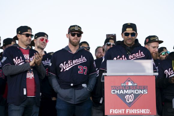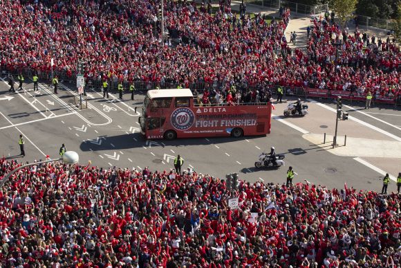Играчите на Нешънълс отпразнуваха историческия успех с шампионски церемониал по улиците на Вашингтон в събота. Стотици хиляди почитатели се стекоха в центъра на града, с цел да видят по какъв начин рейсовете с играчите и техните фамилии прекосяват триумфално " Конститюшън Авеню " и " Пенсилвания Авеню ", носейки със себе си Трофея на комисионера.