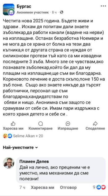 " Ние всички сме отрупани с персонални проблеми, заболявания, заеми. Моля, не убивайте желанието и силите ни да помогнем с дребното, което можем, на същински нуждаещите се! ", обръща се бургазлия към млада майка. Поводът? Пламен Делев твърди, че въпросната дама употребява обществените мрежи, с цел да събира " поддръжка " с най-различни претекстове.