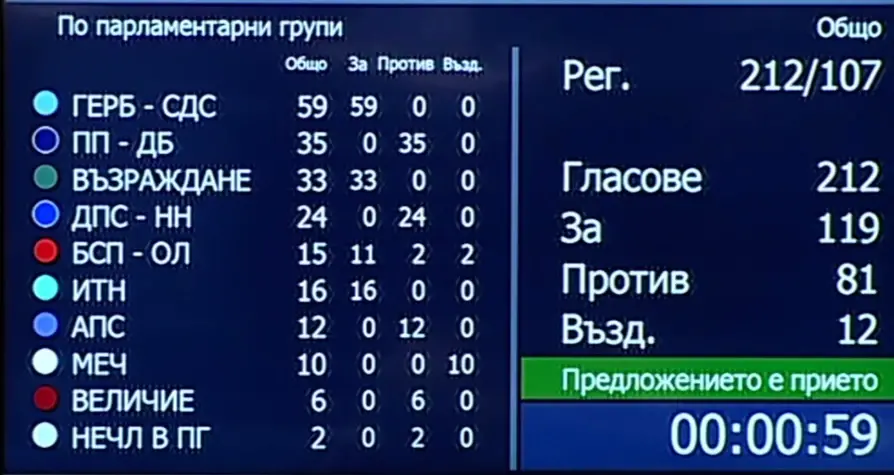 С 212 гласа " за " болшинството зад кабинета в оставка, като се изключи двама депутати от Българска социалистическа партия, и депутатите на Костадин Костадинов одобриха предлагането на " Възраждане " за ограничение на секциите за гласоподаване отвън до 20. Поправките бяха утвърдени на първо четене в пленарната зала, макар че бяха изненадващо и небрежно гласувани от правната комисия преди по-малко от 24 часа.