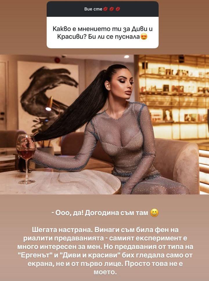 „ Шегата настрани. Винаги съм била почитател на риалити предаванията - самият опит е доста забавен за мен. Но излъчвания от вида на " Ергенът " и " Диви и красиви " бих гледала единствено от екрана, не и от първо лице. Просто това не е моето “, безапелационна е Венцислава.