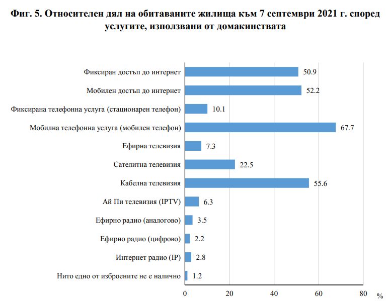 30 020 жилища нямат нито телевизия, нито интернет, както и не разполагат с мобилен или стационарен телефон. В процентно отношение това са 1,2 на 100 от участвалите в Националното броене през 2021г..