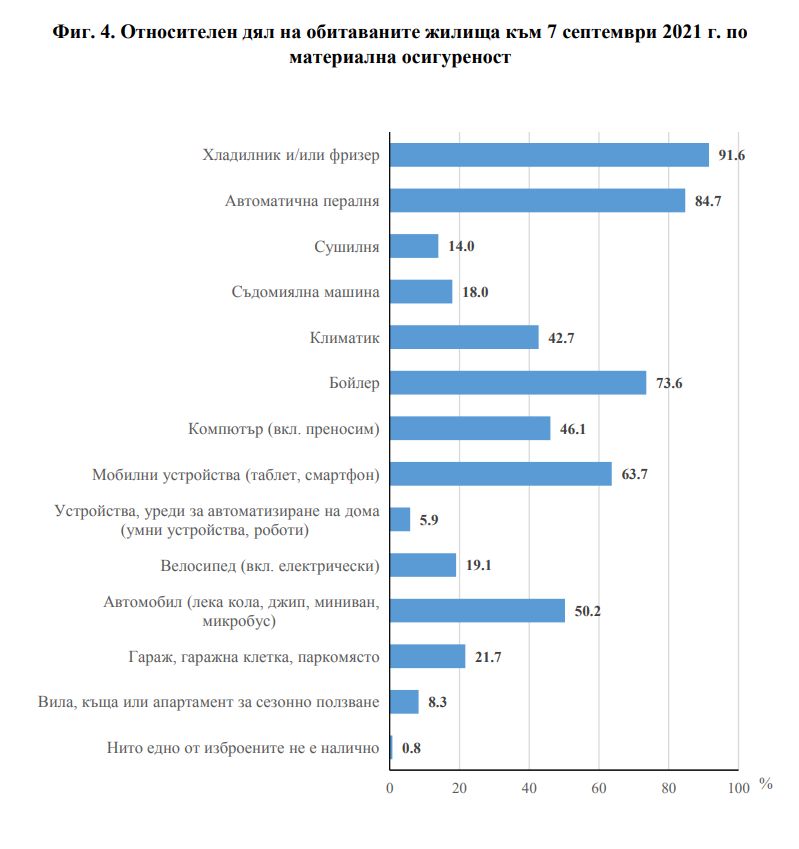 Могат ли българите да си разрешат обикновени улеснения в бита и какъв брой от тях употребяват ледник, пералня и имат интернет? На тези въпроси дава отговор данните от поделение Жилищен фонд, събрани по време на Националното броене от 2021г..
