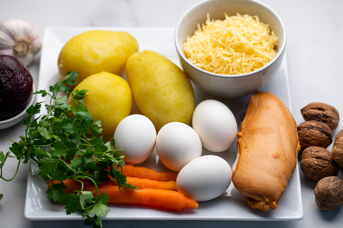 Картофи – 2-3 бр. Пушено пиле – 150 г Морков – 1 бр. (среден по размер) Яйца – 4 бр. Цвекло – 1 глава Чесън – 2 скилидки Орехи – 50 г Сол – щипка Майонеза – 100 г (или повече, на вкус) Нар, грах за украсата Начин на подготвяне: