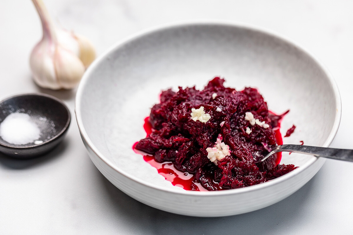 Настържете цвеклото на ренде, прибавете пресования чесън и солта.