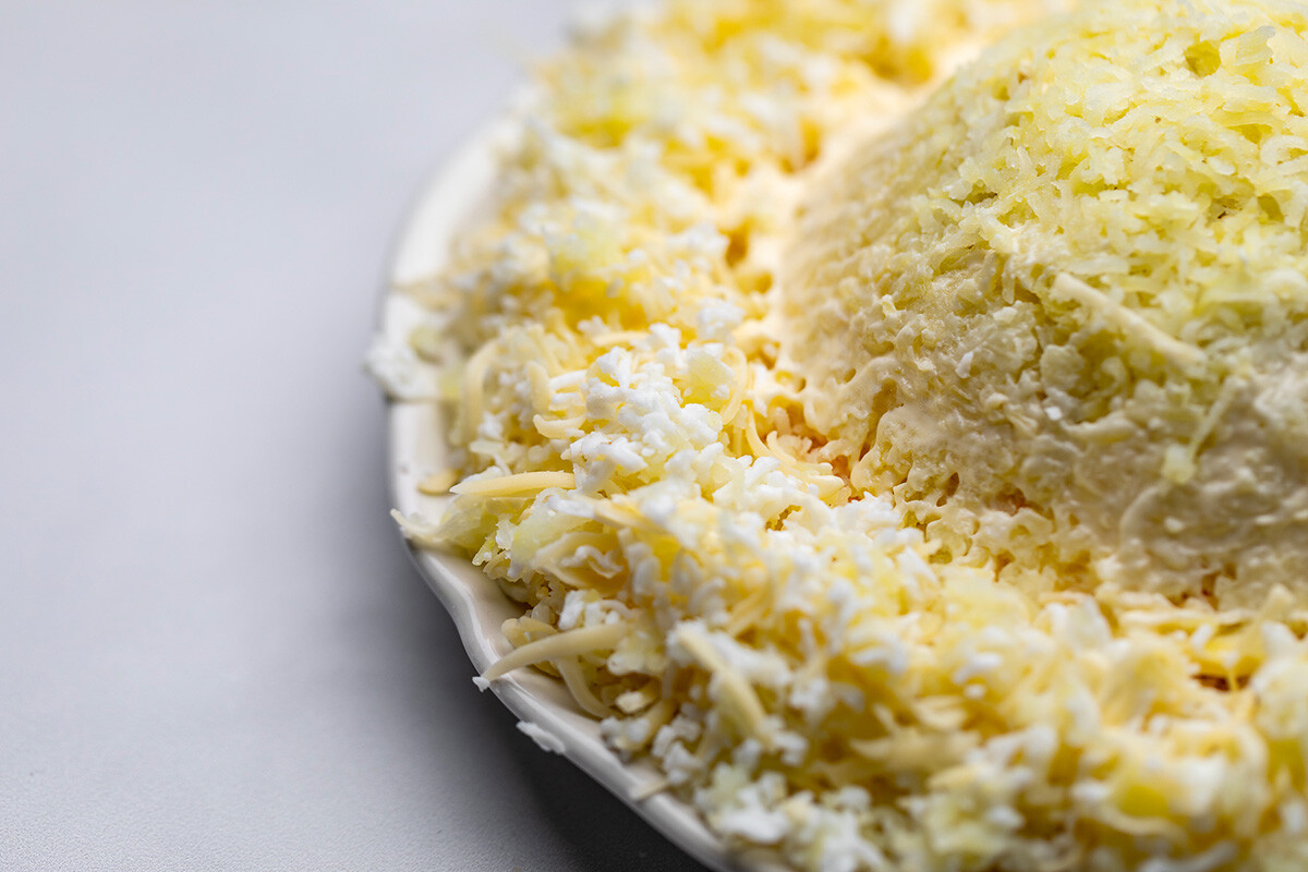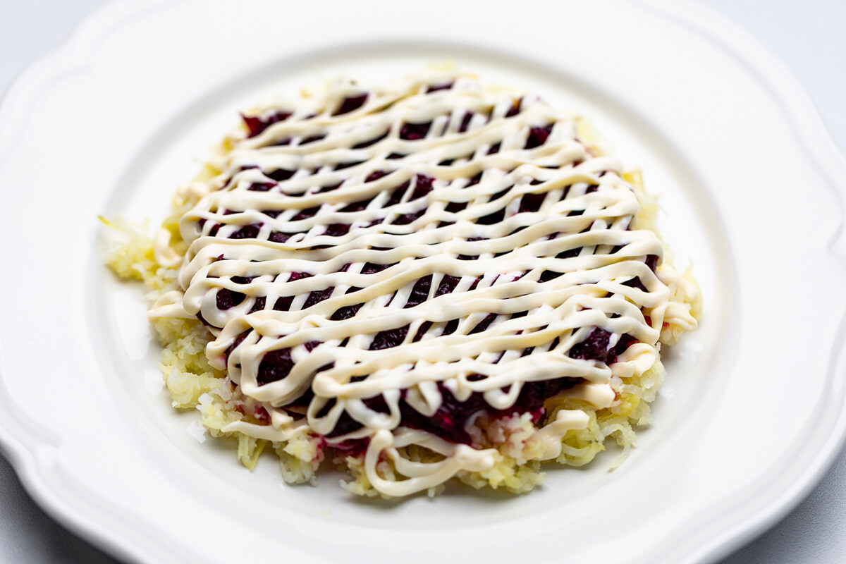 Кашкавалът би трябвало да бъде разграничен на три елементи: първата прибавете към блата от цвекло, втората – към зеленчуците, а третата – към първия пласт от кашкавал и майонеза.
