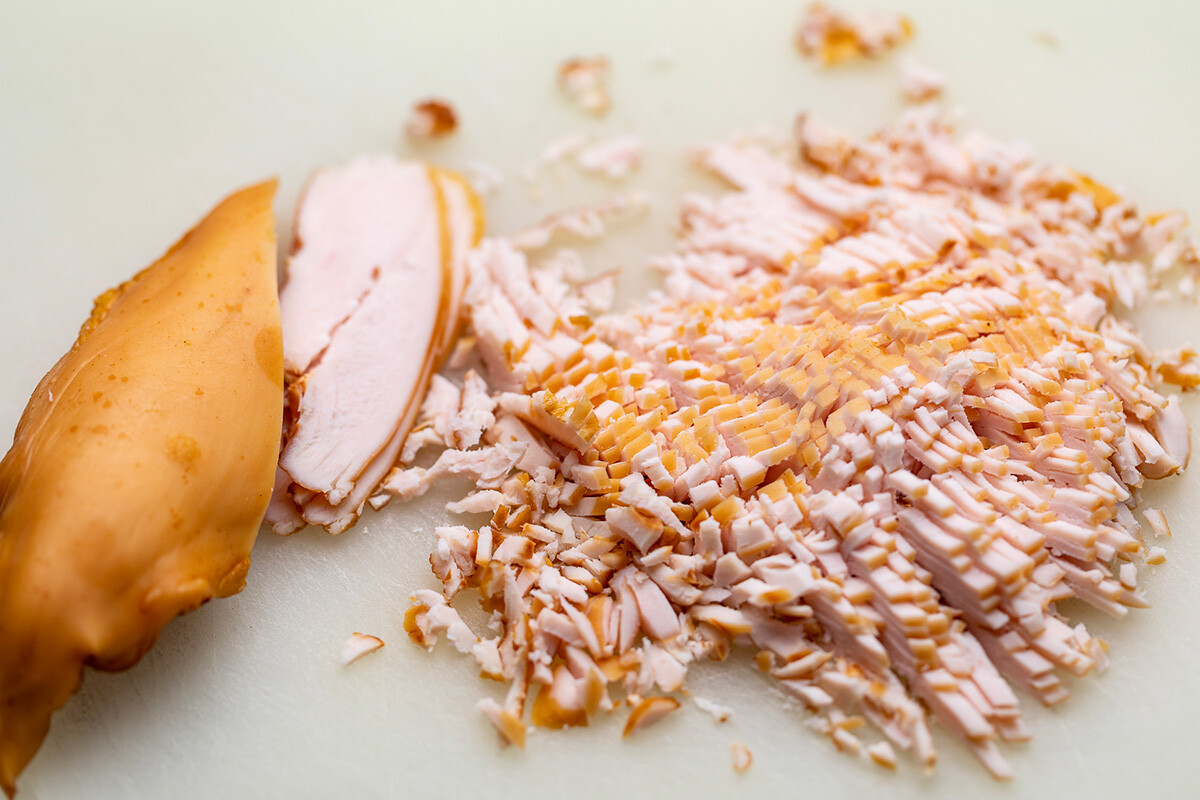 Нарежете пилето на ситно и го разделете на две елементи. Разстелете първия пласт и го намажете с майонеза.