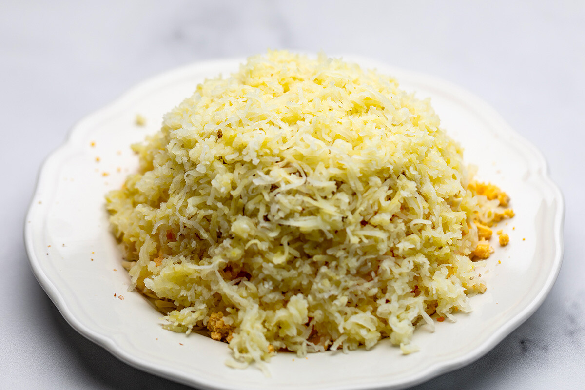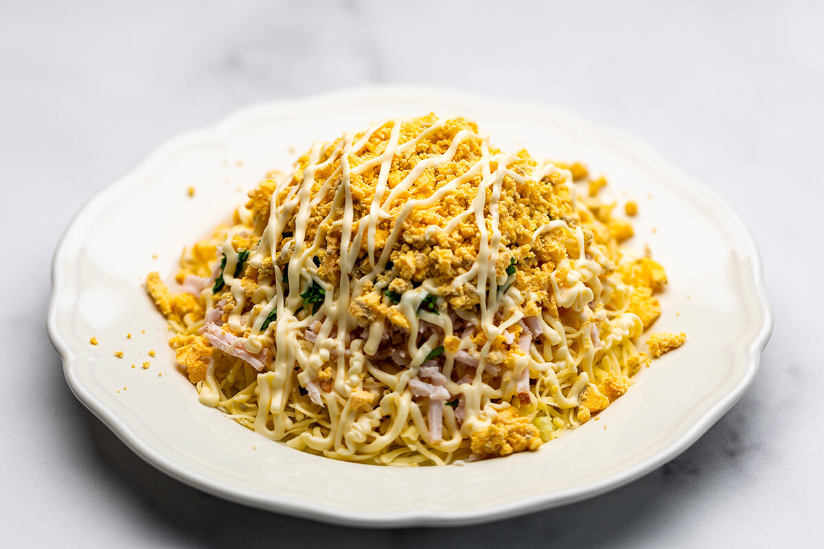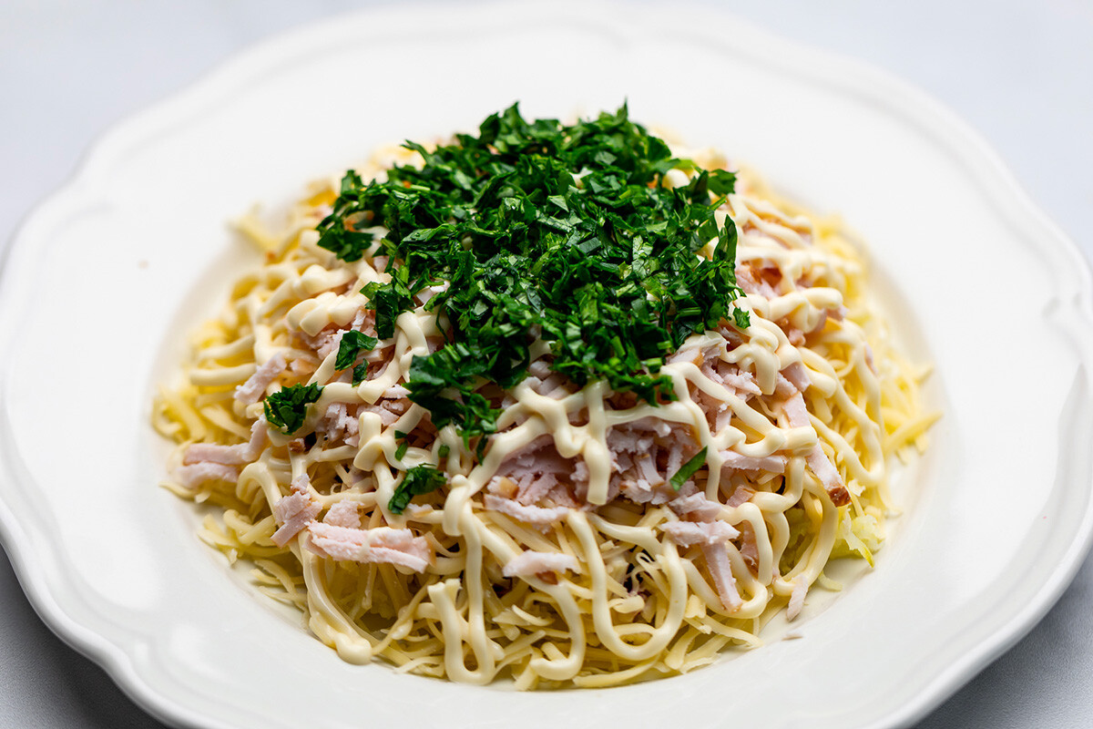 Тази изискана и вкусна салата съдържа едни от най-хубавите артикули от руската кулинарна класика.