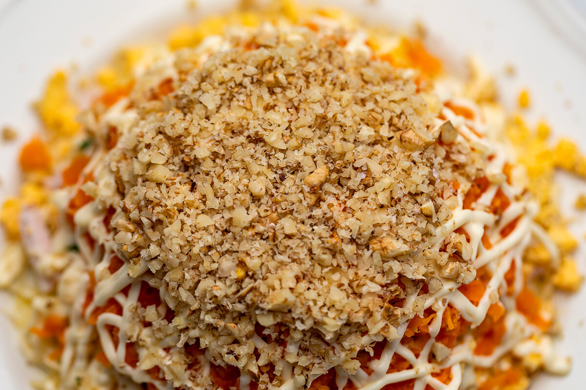 Добавете слой моркови и чесън, прибавете сол и намажете с майонеза.