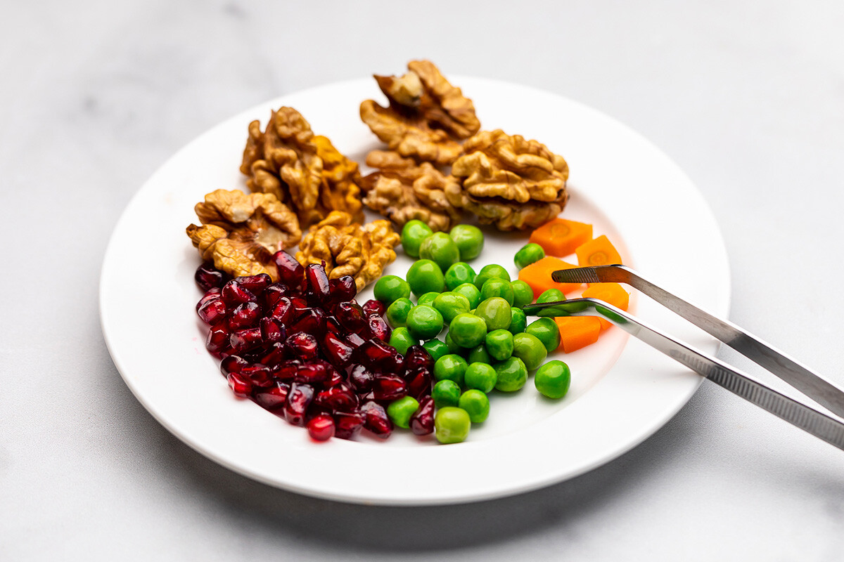 Използвайте зърната нар, късчета моркови, грах и орехи за декорация.