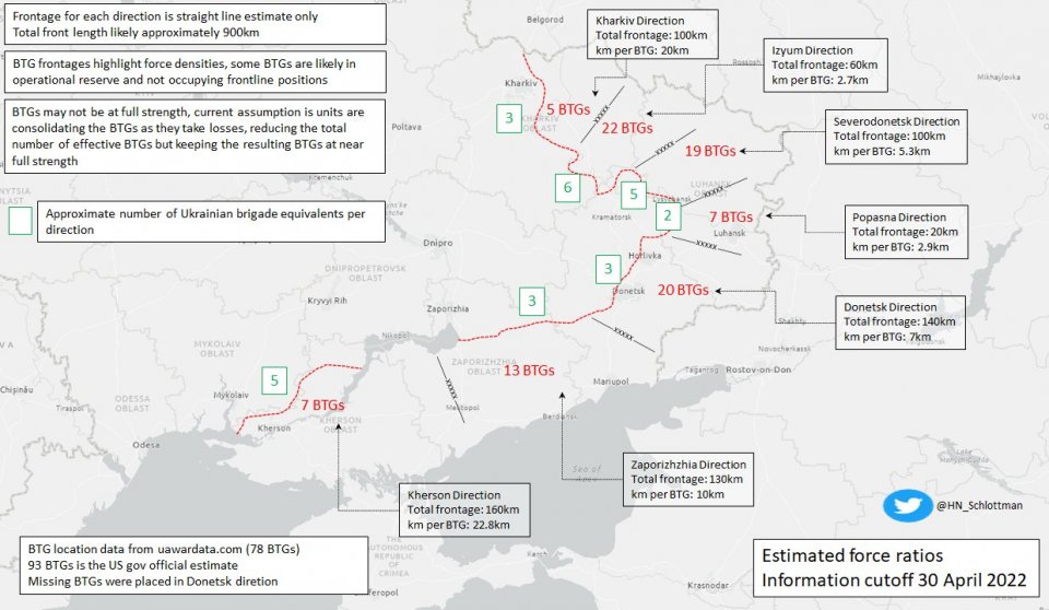 В момента има 4 фронта: Харковски, Източен, Южен и Херсонски. Скоро целият фронт край Херсон ще бъде затворен и Източният ще се проточи от Волчанска до Донецк. Най-горещото място е Донбаската дъга от Барвинково до Горловка, където са ситуирани два укрепени региона - Славянски и Северодонецки. Именно тук съветската войска влага най-големи старания, а украинските сили са в най-сложна обстановка.