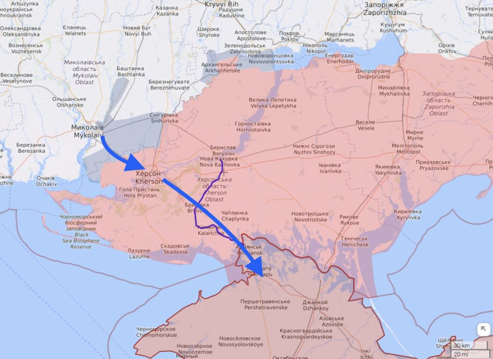 Основното тук е да се пробие немногочислената съветска защита в Херсонска област и да се завладяват мостовете в региона на Херсон и Нова Каховка. При това е доста значимо мостовете да останат цели или най-малко да не са мощно развалени, с цел да могат войските да се трансферират бързо на другия бряг и да продължат офанзивата. След това може да се развива настъплението към Мелитопол и Новоалексеевка. Така Украйна ще получи опция да отреже съветската формация в северната част на Херсонска област и да обстрелва военни бази в Крим, като прекъсне връзката на съветския южен фронт с Крим. Главната цел е освобождението на Херсон. Това ще нанесе голям психически удар по съветската войска и ще вдигне бойния дух на украинците. Отново ще се отреже кримският канал и може дори да се нападна Кримският мост - с авиация или ракети Точка-У.