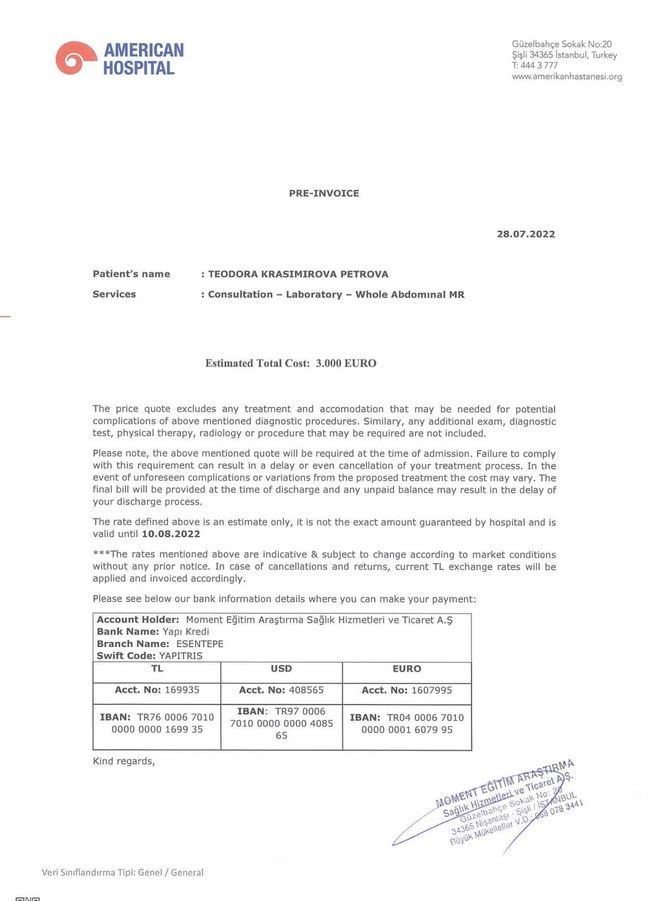 Теди би трябвало да постъпи в клиниката за проучвания и следене на назначеното лекуване на 23 август за което са нужни 3000€.