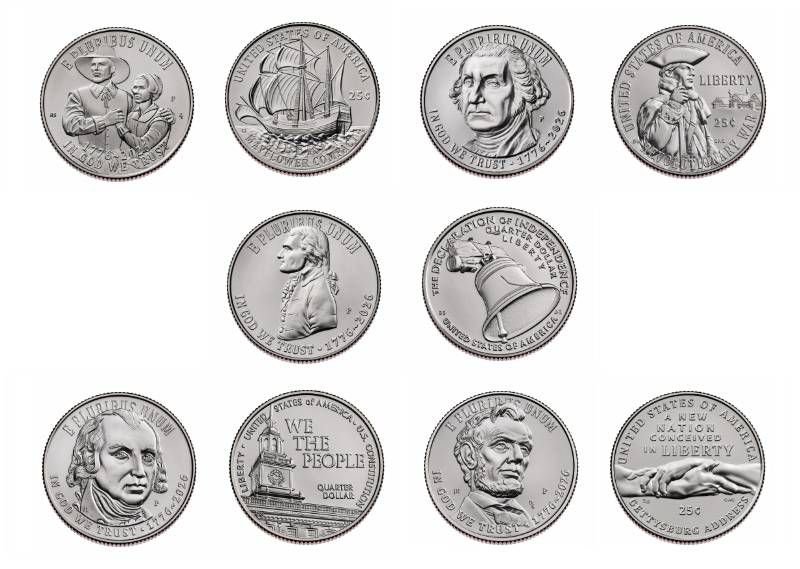 Планирани са пет версии на монетата от 25 цента, изобразяващи надлежно Договора от Мейфлауър, Войната за самостоятелност, Декларацията за самостоятелност, Конституцията на Съединени американски щати и Гетисбъргското послание на президента Линкълн. Монетата от 10 цента ще демонстрира изображение на Свободата - алегорична женска фигура, изправена против тиранията на английската монархия, както и орел, носещ стрели в ноктите си, представляващ битката на Америка за самостоятелност.