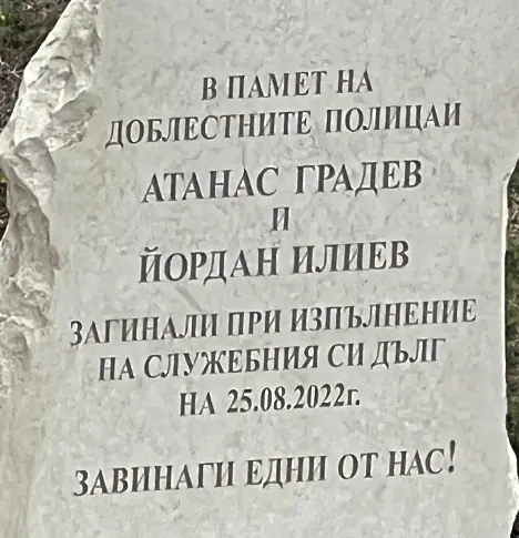 Монумент в памет на служителите на реда Йордан Илиев и Атанас Градев, които починаха при осъществяване на служебния си дълг в опит да спрат рейс с 47 мигранти на основното кръстовище „ Трапезица ” в Бургас ще бъде открит на 25 август т.г. Това разгласи новият шеф на ОДМВР Бургас старши комисар Емил Павлов.