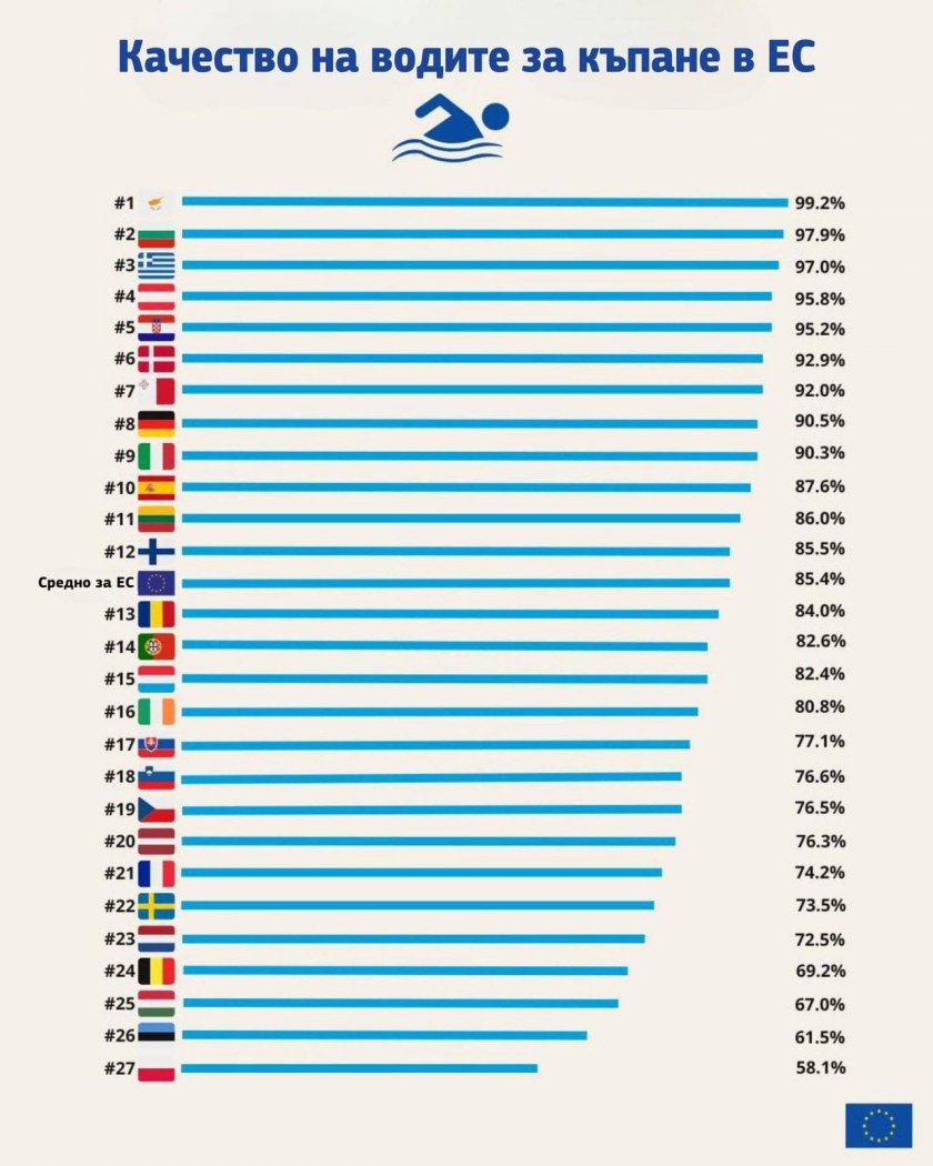 Единствената страна преди нас е Кипър с 99,2%. След нас остават Гърция, Хърватска, Италия и Испания, по чиито плажни линии милиони българи се прехласват.