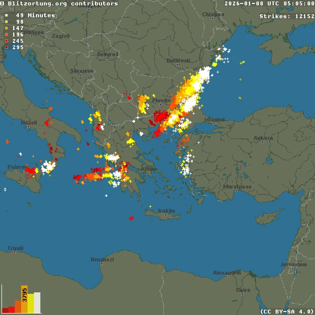 Над 12 000 мълнии бяха регистрирани в Югоизточна Европа през миналата нощ, като епицентърът на тази извънредно нетипична за сезона интензивност бе територията на България. Данните за рядкото метеорологично събитие бяха оповестени тази заран, потвърждавайки прекосяването на мощен леден атмосферен фронт през страната.