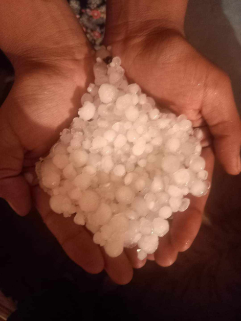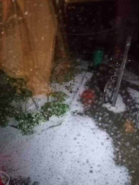 От фрагментите се виждат побелелите пътища от ледени топчета. За малко време дъждът съумя да покрие пътните настилки и дворовете на хората.