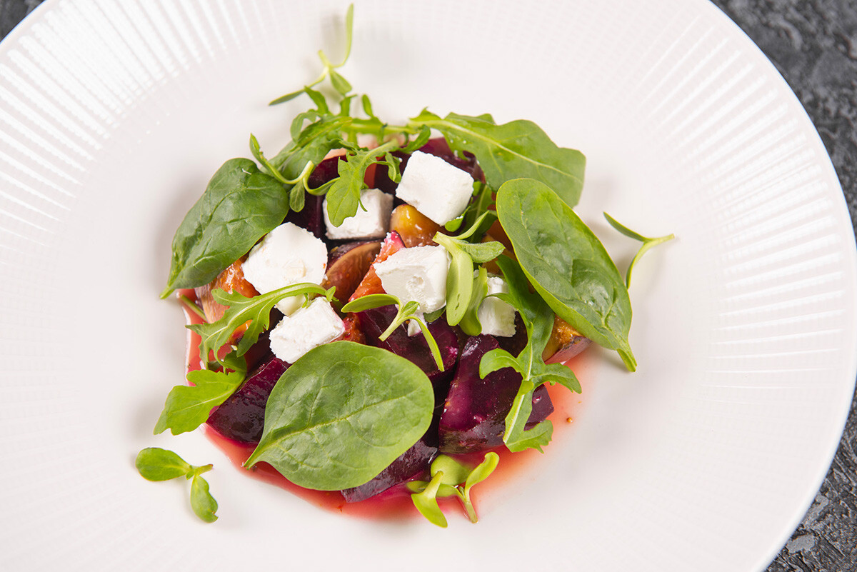 Цвекло, зелени пресни подправки, солено сирене, пресни смокини и сладко-кисел дресинг са съставките за триумфа на тази салата. Подробности в рецептата.