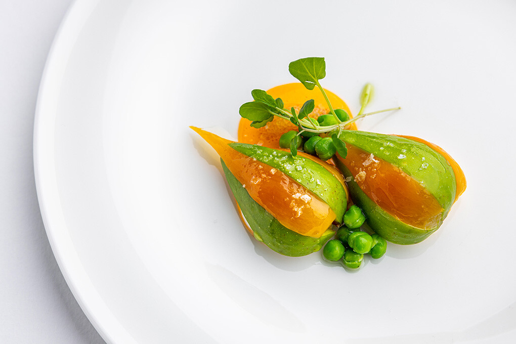 Пропуснете тази стъпка, в случай че нямате опция да готвите по метода су-вид или вакуумно готвене. Главният готвач сервира смокини върху жълтък, сварен по метода конфи. За да направи това, той слага цяло яйце във вакуумирана опаковка и го готви на 62ºC цели 60 минути, след което отделя жълтъка от белтъка и го смесва с лешниковото масло (3 г).