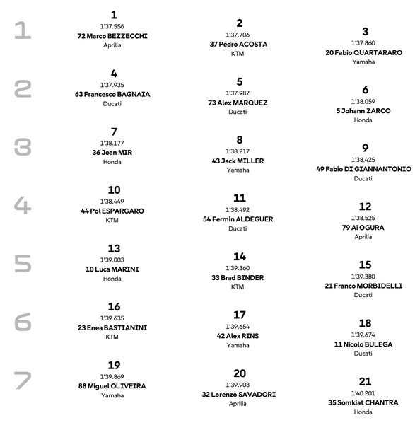 Победителят от вчерашния спринт Алекс Маркес, който е и главният любимец за успеха през днешния ден, ще започва от средата на втория ред след рухването си в квалификацията през вчерашния ден сутринта. Около испанеца на втората редица ще се наредят Франческо Баная и Йоан Зарко, а зад тях от третия ред ще потеглят Жоан Мир, Джак Милър и Фабио Ди Джананатонио.