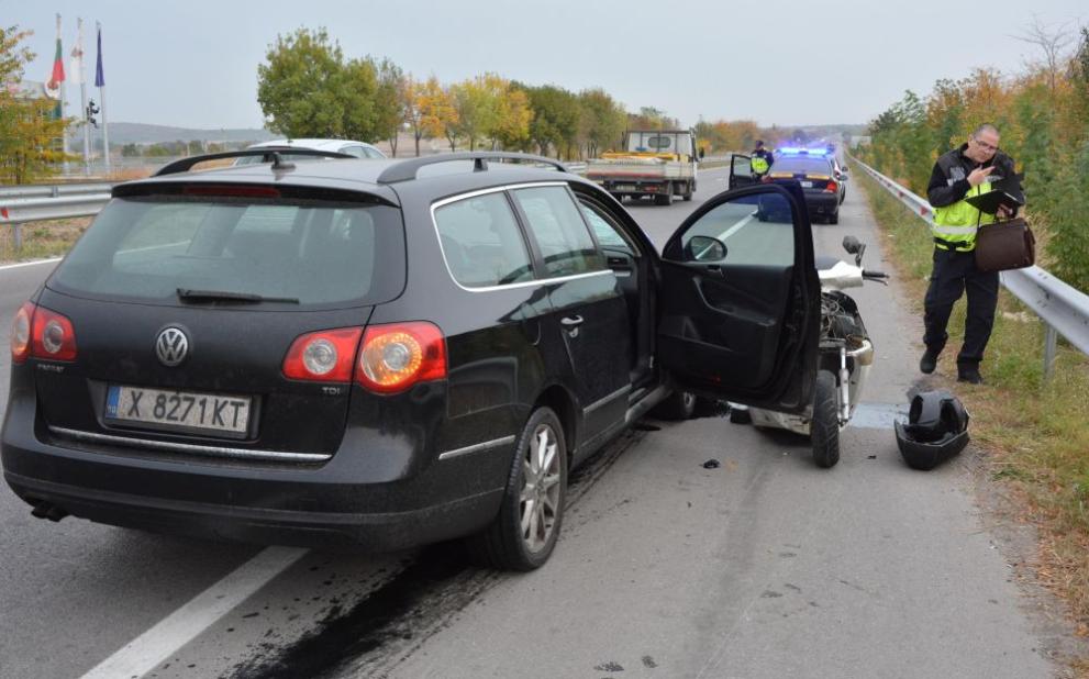 Моторист пострада тежко при конфликт с автомобил по пътя Хасково-Димитровград.