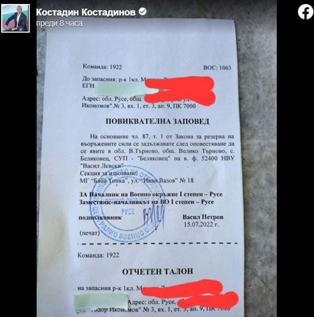 Мой другар през вчерашния ден получи повиквателна от войската и през днешния ден върви във военното окръжие. Взели са му ограничения за униформа и са му създали инструктаж къде да се яви при нахлуване, с цел да бъде извозен с рейсове дружно с другите мобилизирани. Това написа във Facebook страницата си Костадин Костадинов.