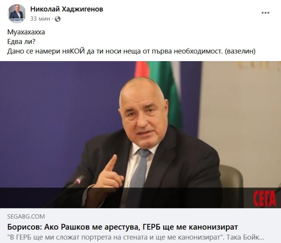 " Муахахахха. Едва ли? Дано се откри няКОЙ да ти носи неща от първа нужда. (вазелин) ". Това написа едно от лицата на ИБГНИ юрист Николай Хаджигенов поради коледното изявление на Бойко Борисов за " 24 часа ".