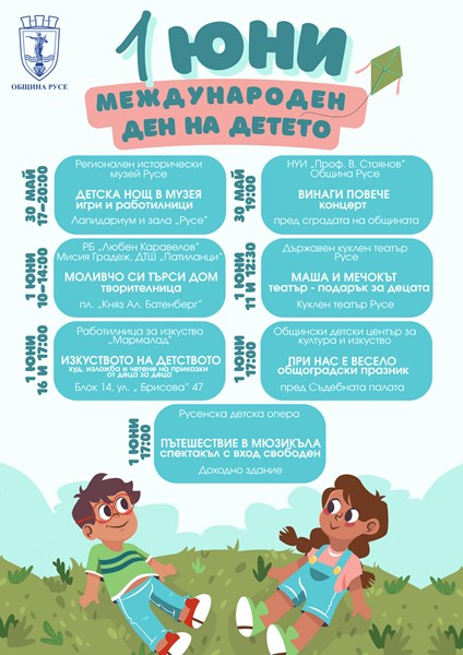 Разнообразна стратегия с креативен работилници, игри, музика и театрални постановки приготвиха Община Русе, културните институции и организации за отбелязването на Международния ден на детето – 1 юни. Празничните събития ще стартират още в петък и ще продължат през целия уикенд.