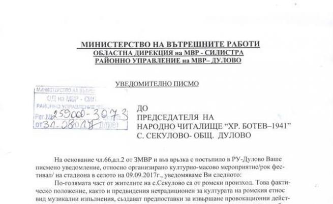 В писмото се показва, че защото „ по-голямата част от жителите на с. Секулово са от ромски генезис. Това фактическо състояние, както и плануваният нетрадиционен за културата на ромския етнос тип музикални осъществявания, основават предпоставки за осъществяване провокационни дейности на етническа основа, които е допустимо за прераснат в всеобщи нарушавания на публичния ред.”
