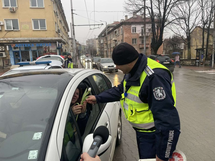 Пътни полицаи във Враца зарадваха с цветя жените шофьори на 8 март