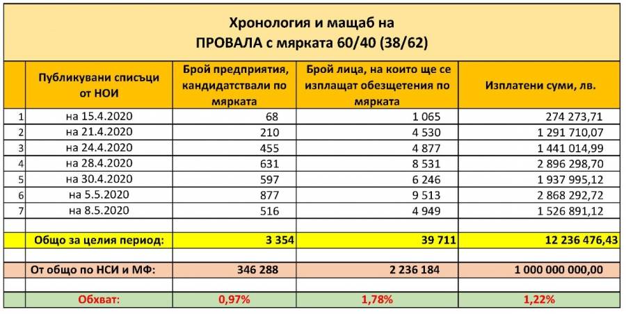 В същото време, общественият и стопански министър не престават да пазят схемата " 60 на 40 " и се регистрираха за свършената работа на 6 май. От Близо 142 000 чиновници на 9850 предприятия ще запазят работните си места с помощта на схемата 60/40. До момента Агенцията по заетостта е обработила 3137 заявки на работодатели за даване на държавна помощ за покриване на 60% от заплатите и осигуровките на 42 222 служащи. Одобрението се прави в период от 7 работни дни след кандидатстването. Националният застрахователен институт (НОИ) е превел обезщетения на 2841 компании в размер на близо 11 млн. лева Със средствата са изплатени възнагражденията на 34 794 чиновници. Само при последния транш Национален осигурителен институт преведе близо 3 млн. лева на 808 работодатели за опазване на заетостта на над 9500 служащи.