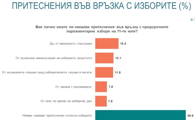 които могат да се трансфорат в евентуална преграда пред част от гласоподавателите. 15.4% от всички интервюирани декларират, че имат терзания от машинното гласоподаване, а 11.8% от вероятни опашки пред изборните секции в следствие от по-бавното гласоподаване. Най-сериозно отражение би имал новият метод на гласоподаване върху гласоподавателите на Българска социалистическа партия, от които всеки четвърти и на Движение за права и свободи, от които всеки трети показва безпокойствие от този избор. 12% имат подозрения за операция на изборните резултати. Значително са намалели терзанията от болест с ковид – 7.8%. Както и на предходните избори, вероятни са по-големи амплитуди на изборната интензивност, не на последно място, и поради разширените благоприятни условия на вота от чужбина.